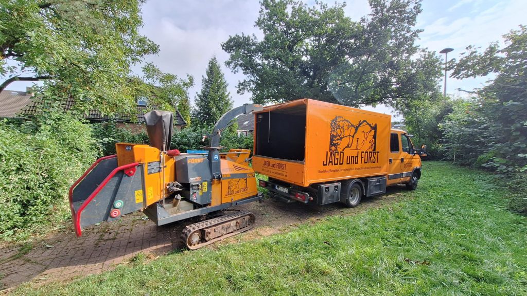 Effiziente Entsorgung von Baum, Strauch und Gehölzabschnitten ab 69€. Mit unserem leistungsstarken Holzhäcksler verarbeiten wir stündlich bis zu 5,5 Tonnen Baum, Strauch- und Gehölzabschnitt mit bis zu 25 cm Durchmesser. Das anfallende Schnittgut kann als Nährstofflieferant auf der Fläche verbleiben oder abgefahren und entsorgt werden. Dank eines verstellbaren Raupenfahrwerks mit minimaler Durchfahrtsbreite von unter einem Meter ist der Holzhäcksler nahezu überall einsetzbar. Empfindliche Gartenbereiche können zudem mit speziellen Überfahrplatten abgedeckt und geschützt werden. Die Abrechnung erfolgt aufwandsbezogen. Eine Bereitstellung der Maschine ohne Bedienpersonal ist ausgeschlossen. Wir machen uns nicht einfach wieder aus dem Staub! Selbstverständlich hinterlassen wir die entsprechende Baustelle ordentlich und übernehmen bei Bedarf die Entsorgung der anfallenden Grünabfälle für Sie.